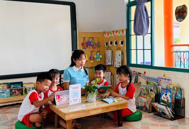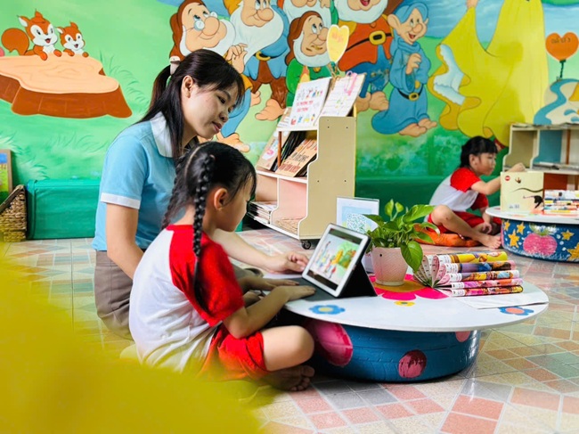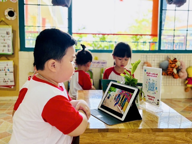 Đặc biệt, nhà trường đã tổ chức đa dạng các hình thức đọc sách nhằm tạo hứng thú cho trẻ như: đọc sách giấy truyền thống, khám phá sách lật với hình ảnh sinh động, quét mã QR để nghe và xem nội dung, cũng như tiếp cận với ebook hiện đại, tiện lợi. Những hình thức này không chỉ giúp trẻ phát triển ngôn ngữ, tư duy mà còn kích thích trí tưởng tượng và niềm yêu thích học hỏi.