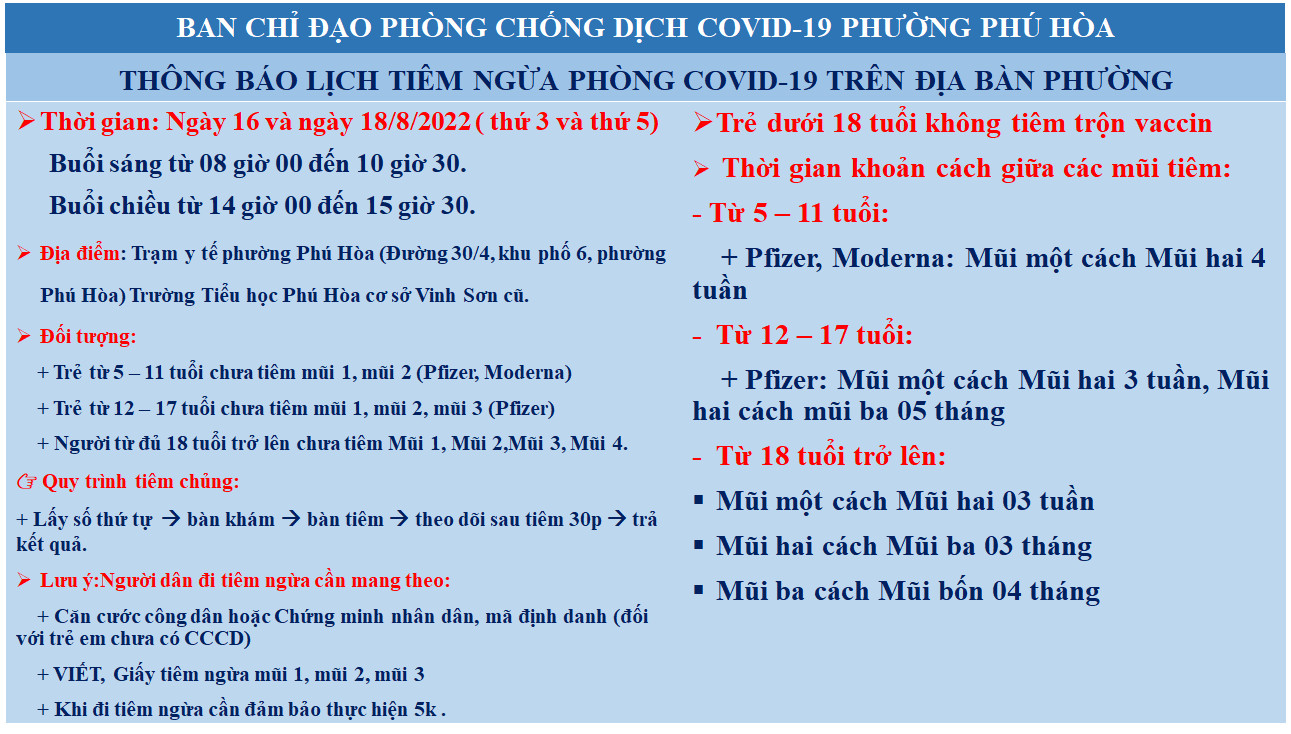 - Địa điểm tiêm: Trạm y tế phường Phú Hòa (Đường 30/4, khu phố 6, phường Phú Hòa) Trường Tiểu học Phú Hòa cơ sở Vinh Sơn cũ.